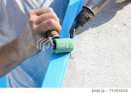 A worker welds plastic cover for water pool. Water pool cover replacement.