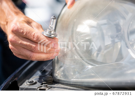 Young man hands changing car bulb or flashbulb of the front headlight or headlamp, repairing car concept