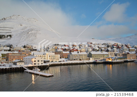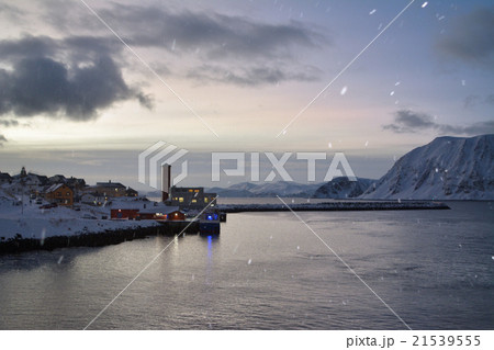 ホニングスヴォーグ港の朝焼けと雪 北欧ノルウェー