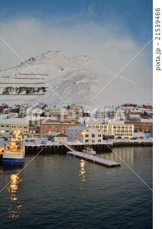 雪山の斜面と港町(ホニングスヴォーグ港) 北欧ノルウェー