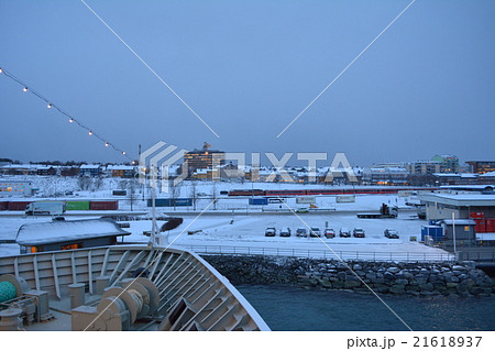 雪が積もった船デッキと港町シェルヴォイの夜景 北欧ノルウェー