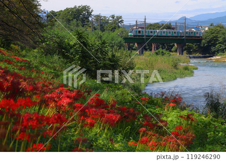 入間川遊歩道のヒガンバナと西武池袋線6050系電車(埼玉県狭山市)