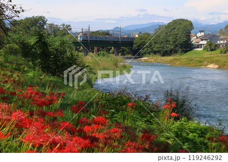 入間川遊歩道のヒガンバナと西武池袋線特急ちちぶ号(埼玉県狭山市)