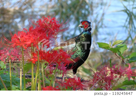 ヒガンバナと野生のキジ(入間川河川敷:埼玉県狭山市)