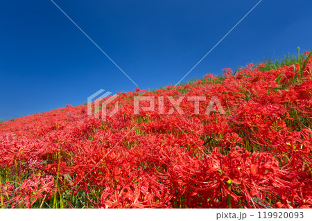 埼玉県川越市平塚新田 青空のもと入間川土手一面の曼珠沙華(彼岸花)群生