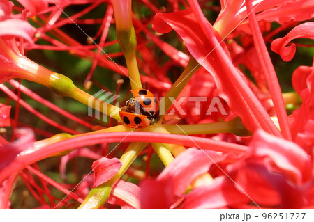 埼玉県川越市平塚新田 入間川土手の曼珠沙華(彼岸花)群生とナナホシテントウ虫
