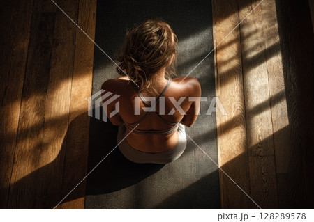 A pregnant woman sits cross-legged on a mat, practicing yoga in a bright, sunlit room. She appears relaxed and focused on her exercises, cropped, copy space
