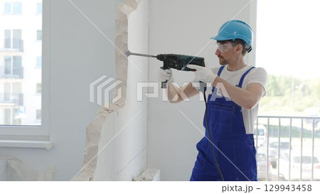 Construction worker demolishing concrete wall with rotary hammer, wearing protective safety gear, generating dust and debris during home renovation work, portrait horizontal view