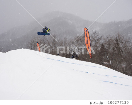 冬の白馬つがいけマウンテンリゾート スノーボードのビッグエア競技で飛ぶボーダー