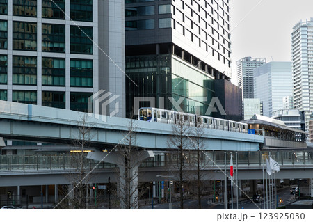 東京汐留の高層ビル群を走る「新交通システムゆりかも」