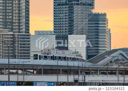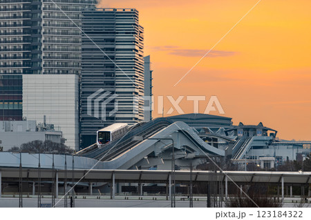 東京臨海副都心夕焼けのなかを行くゆりかもめ