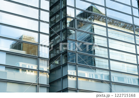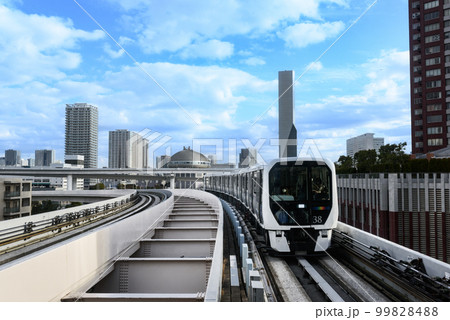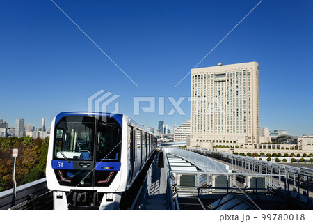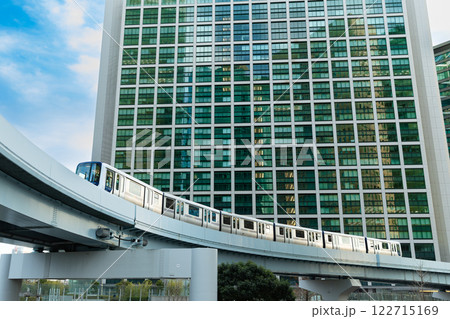 快晴の青空の下 汐留のビル群を駆け抜ける新交通ゆりかもめ