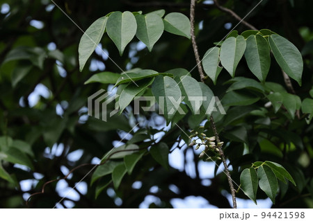 自然 植物 シイノキカズラ、花は夏。葉は五枚から九枚小葉の奇数複葉、革質で光沢があり先細の楕円形