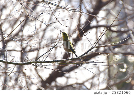 東京都三鷹市の野鳥、木の芽をつまむ早春のメジロ