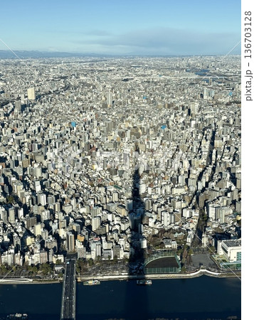 東京の街に伸びるスカイツリーの影_スカイツリーから見た隅田川周辺