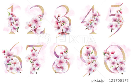 Watercolor and golden numbers with pink cherry flowers and buds, wedding sakura isolated element