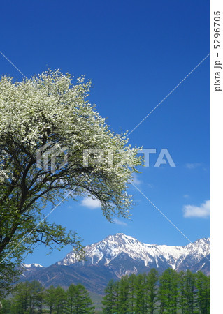 ヤマナシの木と残雪の南アルプス北岳 山梨県北杜市