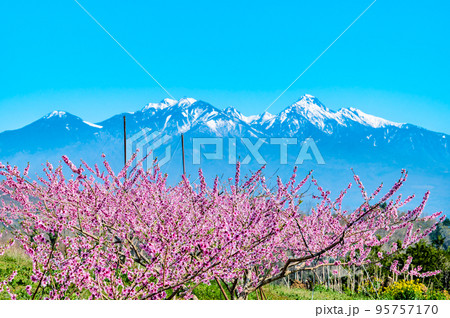山梨県韮崎市 新府桃源郷 ~残雪の南アルプスと桃の花~