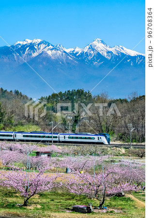 山梨県韮崎市 残雪の八ヶ岳を背景に新府桃源郷を疾走する特急あずさ ~中央本線~