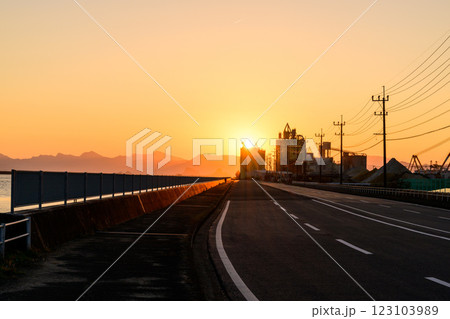 美しい夕日を背景にドライブ道路風景 八代港(八代市)