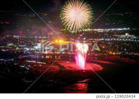 絶景の夜空に映える都市景観風景と夜花火「八代全国花火競技大会(さかもと八竜天文台)」(八代市坂本町)
