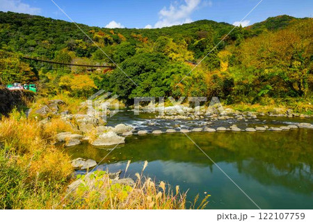 吊橋風景 秋の紅葉スポット・キャンプ場 行楽地スポット 立神峡(八代郡氷川町)