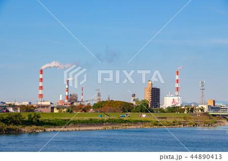 八代市の球磨川河川敷 八代の製紙工場の煙突