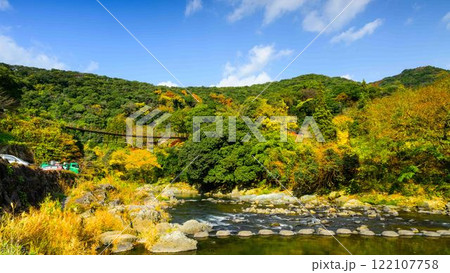 吊橋と川パノラマ風景 秋の紅葉スポット・キャンプ場 行楽地スポット 立神峡(八代郡氷川町)