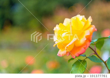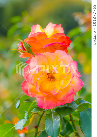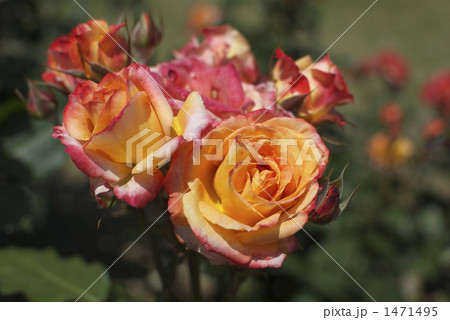 薔薇園に赤色やオレンジ色の薔薇の花が咲いています。このバラの名前は八千代錦です。
