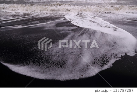 黒い砂浜に美しい波模様