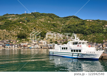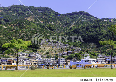愛媛県八幡浜みなっと広場から望む港の船と段々畑の風景