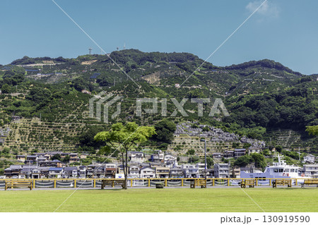 愛媛県八幡浜のみなっと広場とみかんの段々畑の夏景色