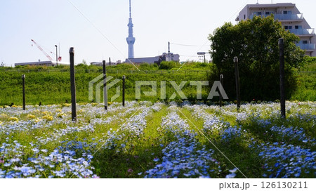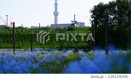八広水辺公園付近に咲くネモフィラとスカイツリー