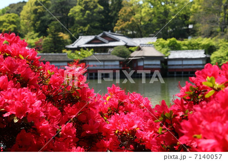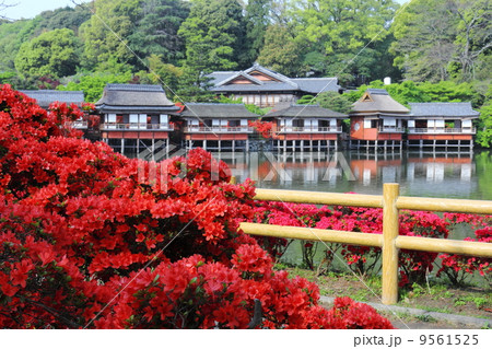 京都 長岡京市 キリシマツツジと八条ヶ池(後方は数寄屋造りの料亭)(長岡天満宮、晩春)