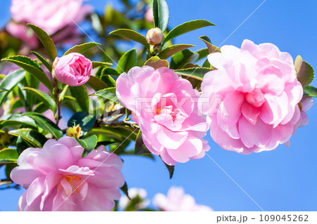 晴れた日の青空をバックに撮った山茶花、サザンカ
