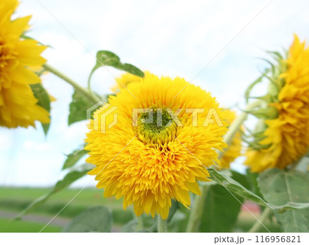 茨城県筑西市宮山地区ふるさとふれあい公園近く あけのひまわりフェスティバルの八重向日葵クローズアップ