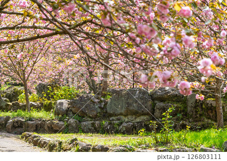 うららかな春日和に映える桜咲く境内風景(八重桜) 「不動尊一心寺の桜(大分県)」