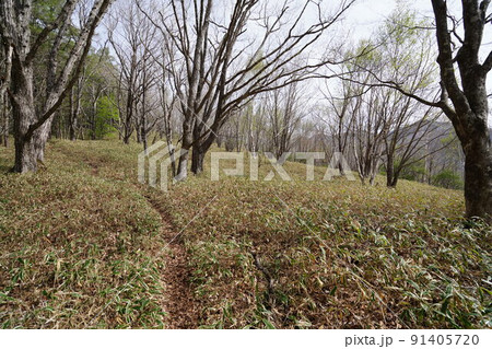 群馬県みどり市 郡界尾根コースの登山口から後袈裟丸山 広い緩やかな八重樺原を下山中の笹原