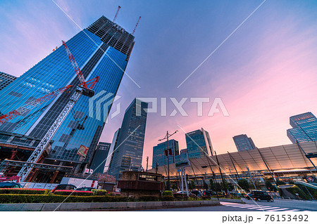 日本の東京都市景観 夕焼けに映える東京駅八重洲口再開発などを望む