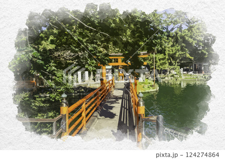 水彩画風 真清田神社 開運橋と八龍神社と厳島社 愛知県一宮市