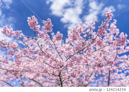 青空と21世紀の森公園に咲く河津桜 福島県いわき市