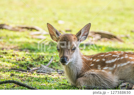 木陰で横になる子鹿 飛火野園地