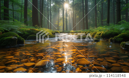 光が差し込む森に流れる川 AI生成画像