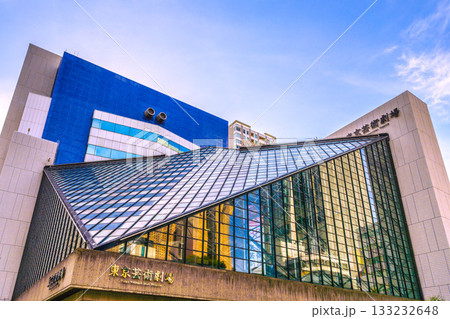 日本の東京都市景観 新風景。池袋駅前の池袋西口公園・東京芸術劇場やガラス窓に映る超高層ビルなどを望む