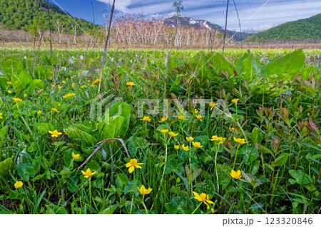 リュウキンカ咲く竜宮付近の尾瀬ヶ原から見る残雪の至仏山