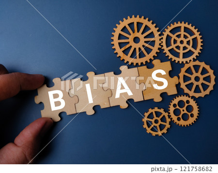Hand holding wooden puzzle with the word BIAS on a blue background.