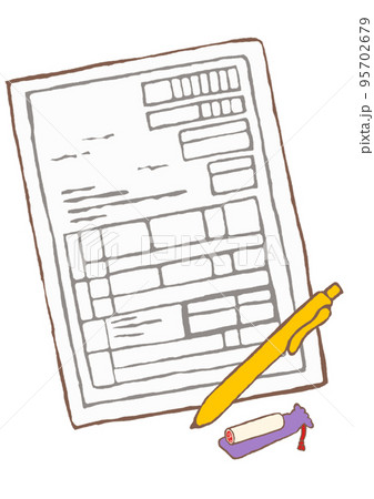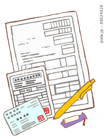 申請書と保険証と限度額認定証と印鑑とボールペンのイラスト