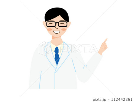 笑顔で指さしする白衣を着た男性