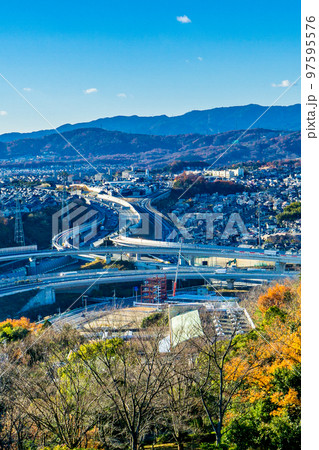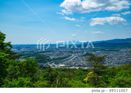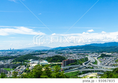 大阪府の摂津の街並みと名神高速と竜王山