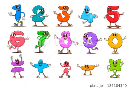 Math number groovy characters, vector funny kids mathematics and education personages. Cartoon retro math symbols and digits with happy smiling faces. Psychedelic groovy numbers from zero to nine